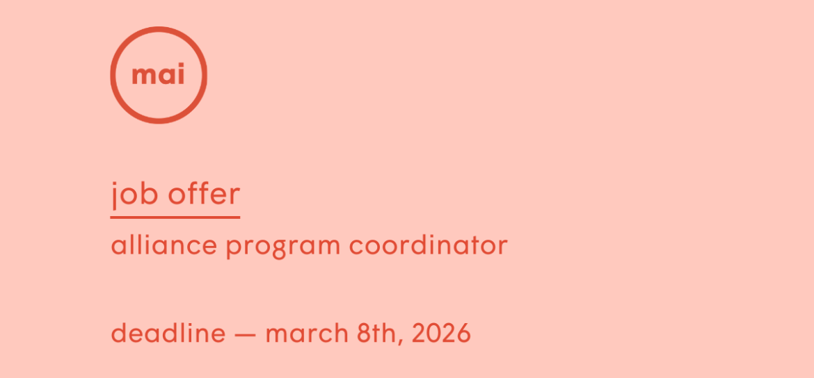 – Coordination of the annual CAM + Centre PRIM partnership: coordinating the call for projects, answering artists’ questions, submitting received projects to the MAI’s Executive director, Centre PRIM, and the evaluation committee, organizing the evaluation session, and supporting the winning applicant in developing their project in collaboration with the MAI’s Artistic director until the project’s presentation at MAI.