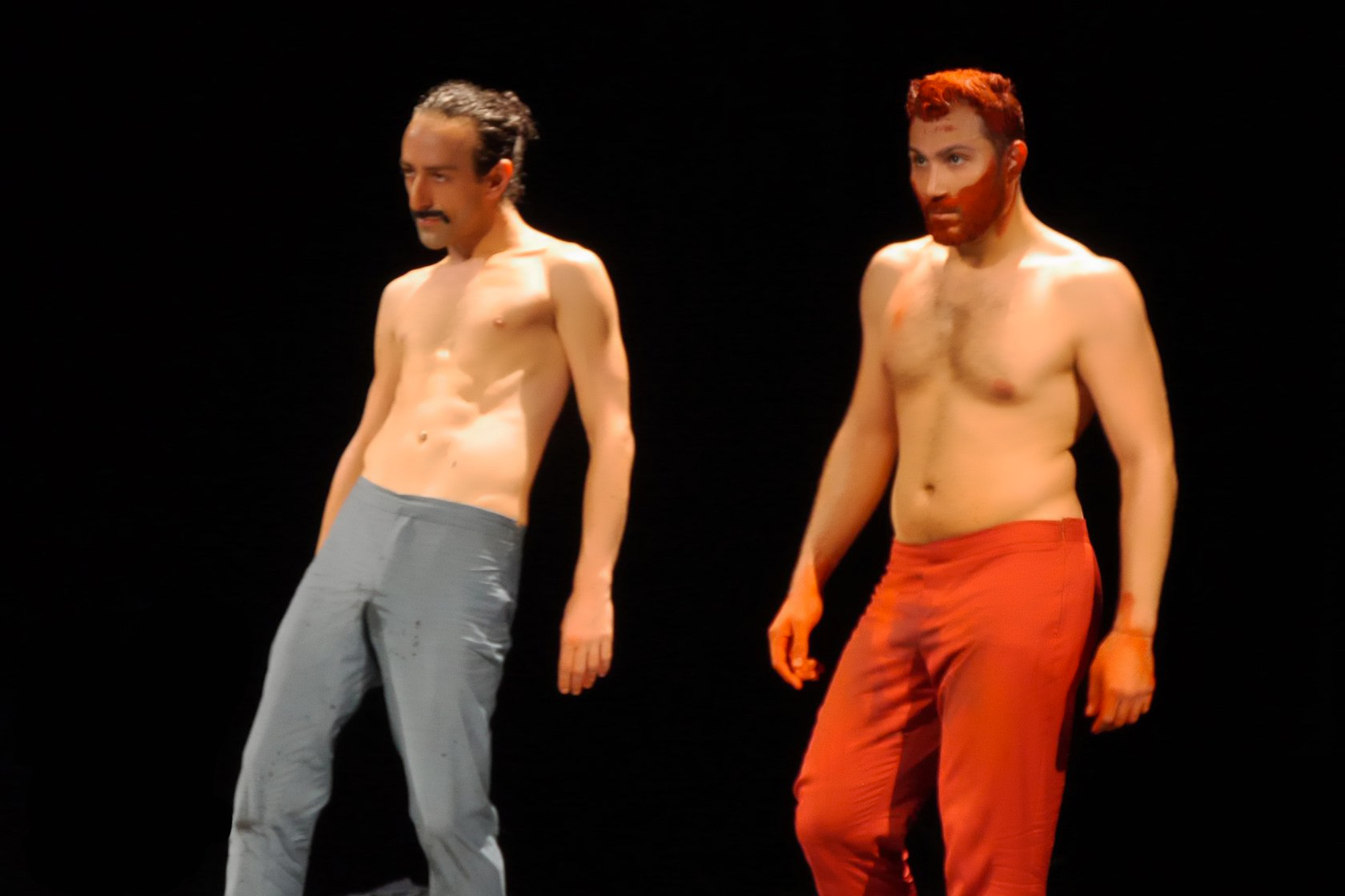 Fa’addebhou li (« Dresse-le pour moi ») is the entreaty of parents whose son is not following what they believe is the right path closely enough – the path of tradition and patriarchal expectations. Choreographer Nancy Naous highlights the unsustainable construction of the male body in Arab society, in the daily lives of families and siblings. She stages two bodies (Nahid Bahsoun, Alexandre Paulikevitch) of men trapped in a straitjacket of inheritance and contradictions. Strong, tough, and idolized, they are moved by capacious desires and hidden insecurity. A dancer and actor of Lebanese origin, and founder of the company 4120.CORPS, Nancy Naous works with gestures from traditional dances and movements anchored in middle-eastern daily lives.