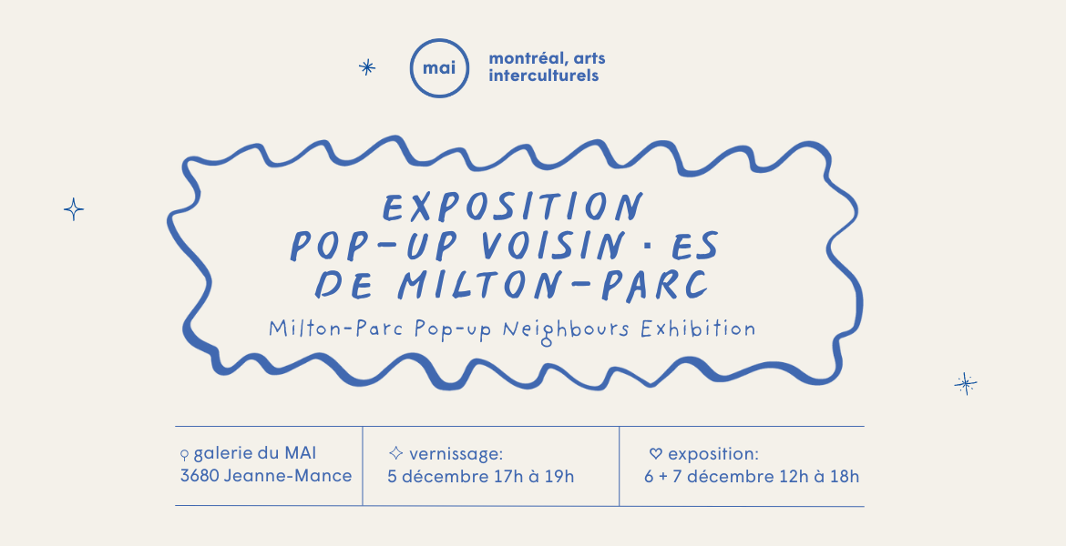 Ancré depuis plus de 25 ans dans le quartier Milton-Parc, le MAI souhaite rendre hommage à la vitalité et à la sensibilité artistique de celles et ceux qui l’habitent. Cette exposition est ainsi une fenêtre ouverte sur les élans créatifs du voisinage, une invitation à rencontrer l’âme du quartier à travers les œuvres de ses résident·es, du 5 au 7 décembre.